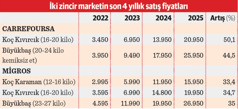 Kurbanlık hisse satışlarında kıymetli bir yere sahip olan zincir marketler, her geçen yıl birer birer satışlarını durduruyor. Geçen yıl 3 zincir market kurbanlık pay satışı yaparken, bu yıl yalnızca iki tanesi satışlarını devam ettirdi. Satışlarını devam ettiren marketler küçükbaş hayvan cinsine nazaran fiyat artışı yüzde 33 ile yüzde 50 ortasında değişiyor. Büyükbaşta ise yeniden fiyatlar yüzde 35 ile yüzde 44,5 ortasında değişiyor. Zincir marketlerin kurbanlık pay fiyatı ise son 4 yılda 5 kat artış gösterdi. Bölüm temsilcileri, kurban pay satışı yapan zincir market sayısındaki azalmayı talep eksikliği ve kârlılığın az olmasından ötürü satışlarını durduklarını belirtiyorlar.